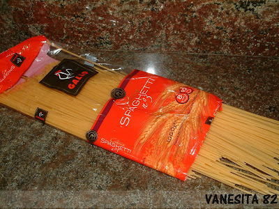 Cortamos las salchichas en trocitos a nuestro gusto, las mias como eran pequeñas las corté en 3 trozos, pero si son grandes las cortais en más. Luego, atravesamos las salchichas con unos espaguettis cortados por la mitad, con cuidado que no se rompan. Yo puse 3 mitades por salchicha, pero eso también al gusto de cada uno. No pongais los trozos muy grandes, porque al cocer las salchichas hinchan un poco y luego son incomodas de comer.